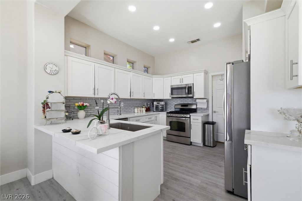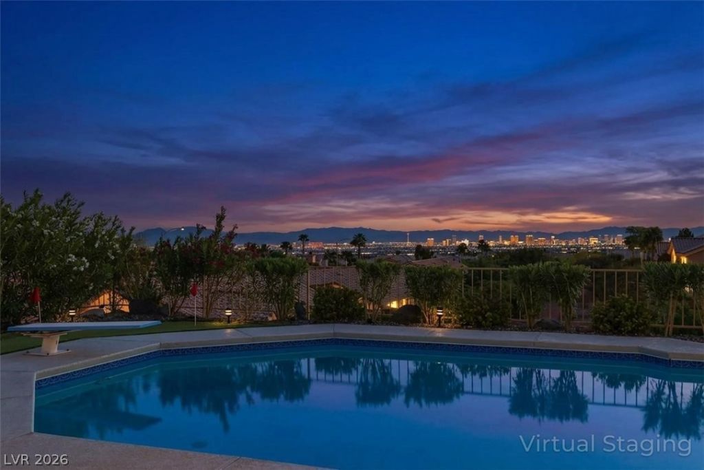 Experience elevated living in this stunning single-story home in Sun City Summerlin, a premier 55+ community in Las Vegas. Perched high above the valley, this property captures stunning 180-degree views of the Las Vegas Strip and surrounding mountains. This beautifully upgraded home features a solar-heated 13ft deep pool with diving board, outdoor shower and putting green, creating the perfect backyard oasis for relaxing or entertaining while enjoying unobstructed Strip views. Inside, the open-concept floor plan is filled with natural light and features luxury flooring, a cozy fireplace and modern finishes throughout. The designer kitchen is equipped with quartz countertops, white shaker cabinets, stainless steel appliances and ample storage, ideal for both everyday living and hosting guests. Updated bathrooms and thoughtfully designed spaces further elevate comfort and functionality. Large windows throughout the home connect indoor and outdoor living, maximizing both light and views.