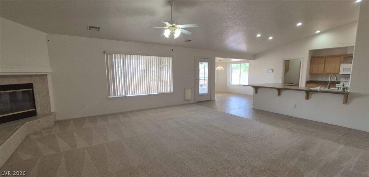 Ranch style floorplan w/ substantially spacious rooms. Formal front entry w/ custom porcelain tile insert, rear facing living room w/ wood burning fireplace & open floorplan to the kitchen & breakfast nook. Kitchen w/ L-shaped penisula, overlooks living room & has easy access to dining room & breakfast niche. Front part of laundry room contains a built-in desk & exit to garage, which is off of the kitchen. Front facing guest bedrooms both contain bay windows, ceiling fans & lights. Very spacious rear facing primary bedroom can hold large furnishings. Primary bathroom has dual sinks, make-up area, separate tub & shower, walk-in closet, & a doorway to the covered patio. Backyard contains desert style landscaping & a frame/stucco shed built on a slab. Side yard has RV parking w/ water, electric & sewer connections. The house is pre-wired for alarm system, surround sound & water filtration system. The covered patio had the roofing replaced approx 1 year ago with TPO roofing membrane.